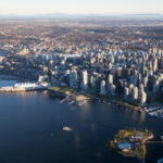 Aerial View of Vancouver Downtown, British Columbia, Canada, during a bright spring sunset.